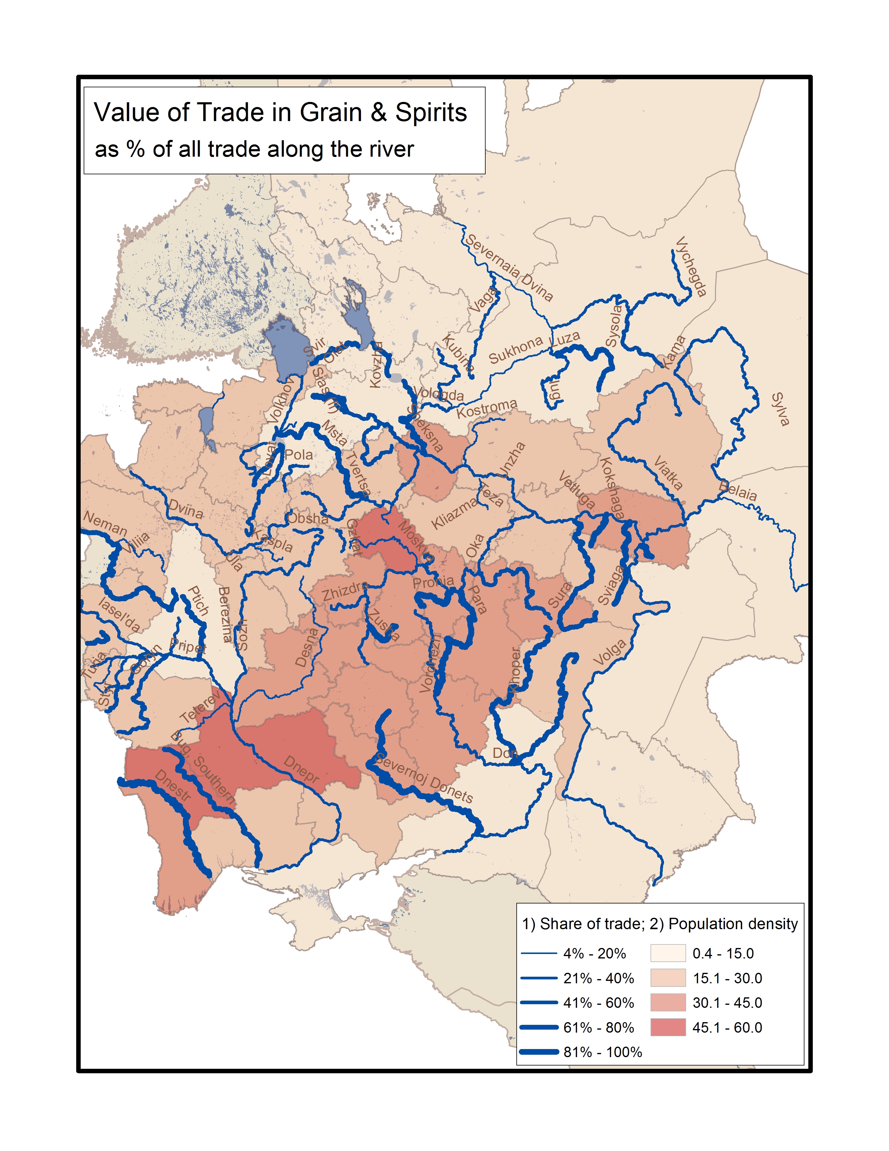 Kelly O'Neill, “Grain & Spirits: share of trade along each river (with population density layer),” The Imperiia Project: Map Gallery Site, accessed March 5, 2026, https://imperiia.omeka.fas.harvard.edu/document/41.