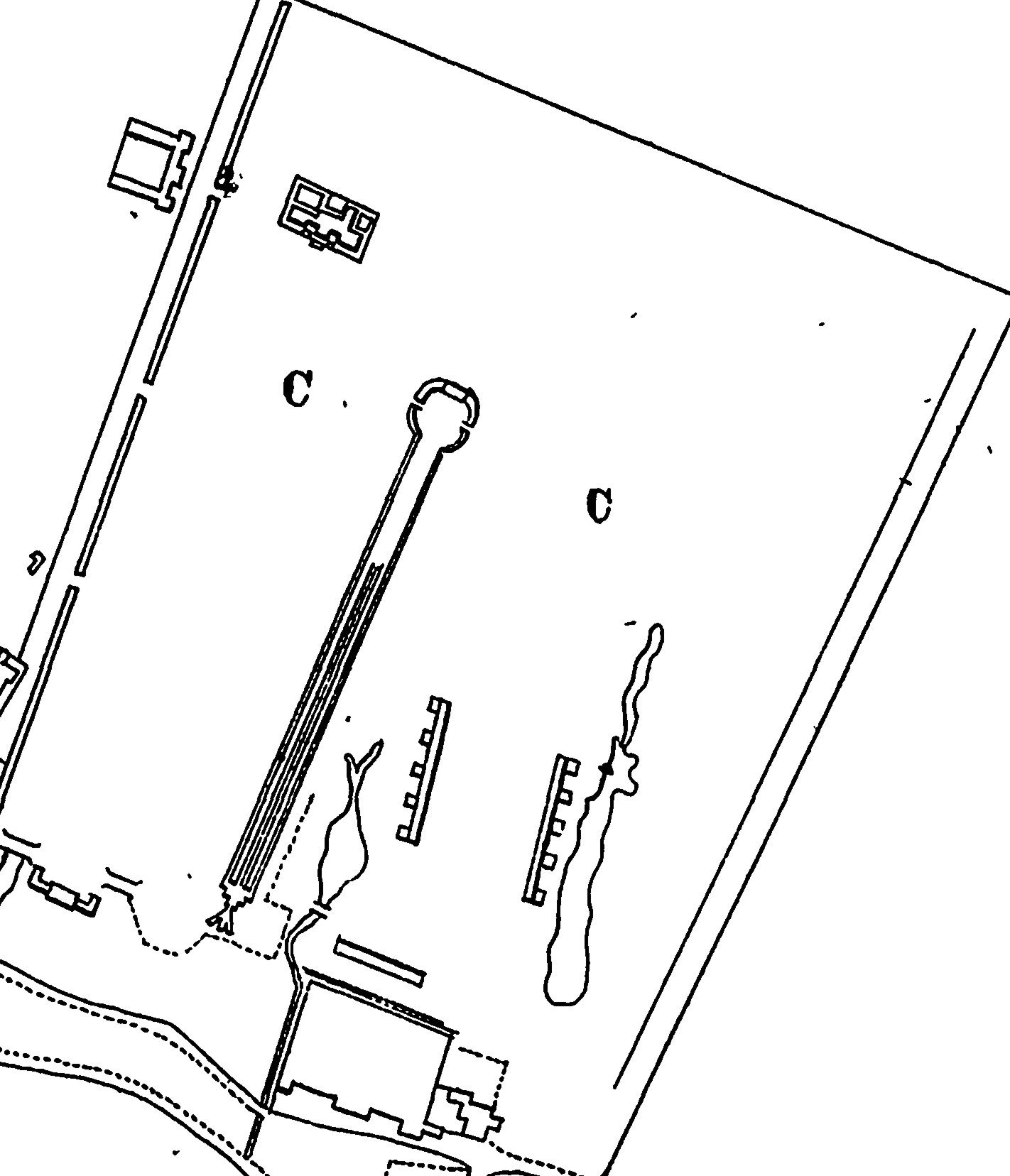This one is maddening. These gardens occupy a huge amount of space and yet they are represented by simple polygons, utterly devoid of detail. The larger garden, located on the eastern edge of the plan, seems to include a pond or two, and a building complex in the northwest corner. But what are the structures next to the ponds? Are the smaller structures docks? Is the largest one a long promenade?