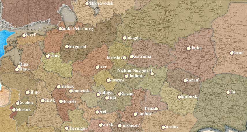 Provincial towns ranged from the relatively humble (Vologda) to the grandiose (St. Petersburg). Some boasted long urban histories, such as Moscow or Kiev, while others were essentially conjured out of thin air by imperial decree, such as Kherson and Simferopol. A few qualified as economic centers or trading hubs (think Riga or Novgorod); a handful were cultural centers (think Vilno or Tiflis). Others were frontier towns first and foremost, such as Ufa and Tobol'sk.