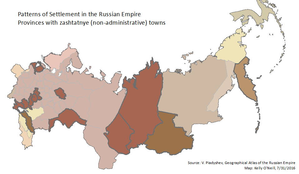 The Piadyshev atlas uses the same symbol to describe both zashtatnye and pripisnye towns. Pripisnye goroda, or registered towns, are the predominant form. The following provinces contain zashtatnye, rather than pripisnye, goroda: