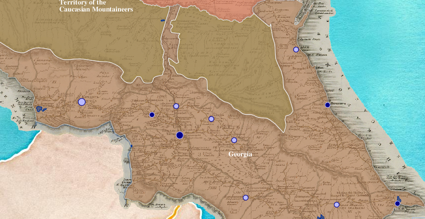 In the former kingdom of Georgia, annexed by Russia in 1801, we find towns distinguished by size and marked as fortified or unfortified.