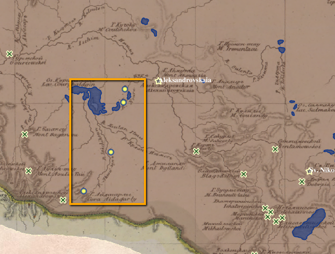 This is one of the most surprising map layers. Of the 59 sheets of the Piadyshev atlas, only one includes mosques in its legend. If you were to take the atlas as an authoritative source for the cultural geography of the empire, you would have no choice but to conclude that there were but four mosques in the entire Russian Empire, and that all of those mosques were located within 175 kilometers (roughly 100 miles) of each other, along the Akshi-kun and Nura rivers, both of which flow into Lake Kurgaldzhin in Omsk province. (Click here to see them on the interactive map.)