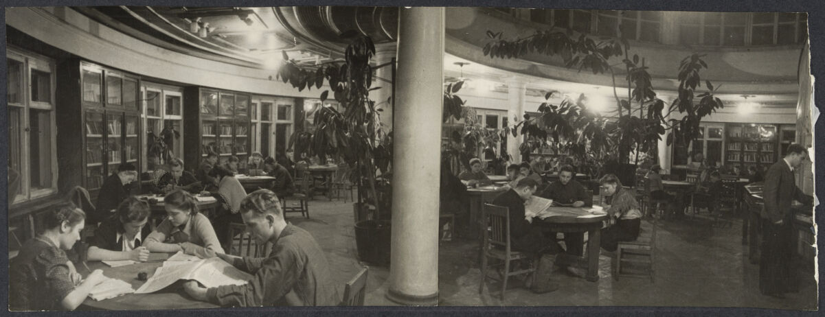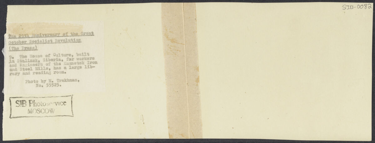 9. 29th anniversary of the Great October Socialist Revolution (The Press) The House of Culture built in Stalinsk, Siberia, for workers and engineers of the Kuznetsk Iron and Steel Mills, has a large library and reading room.