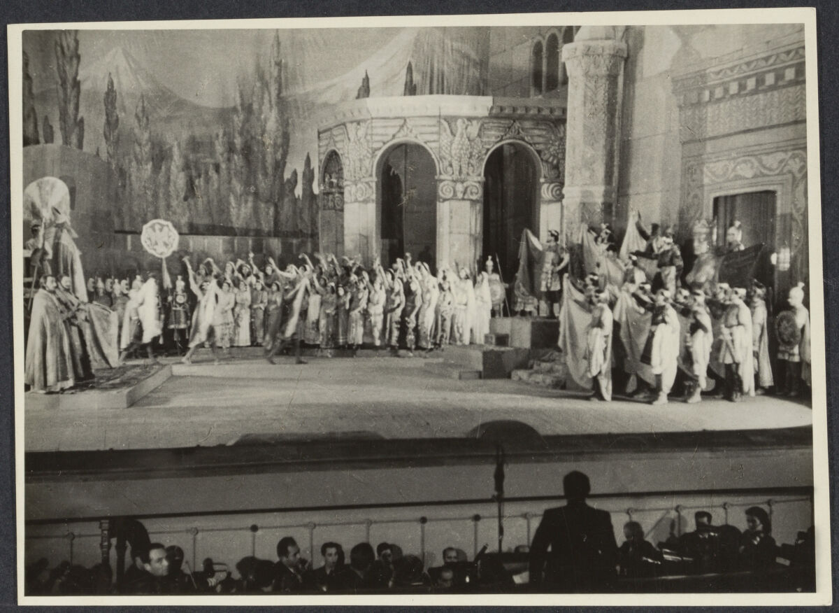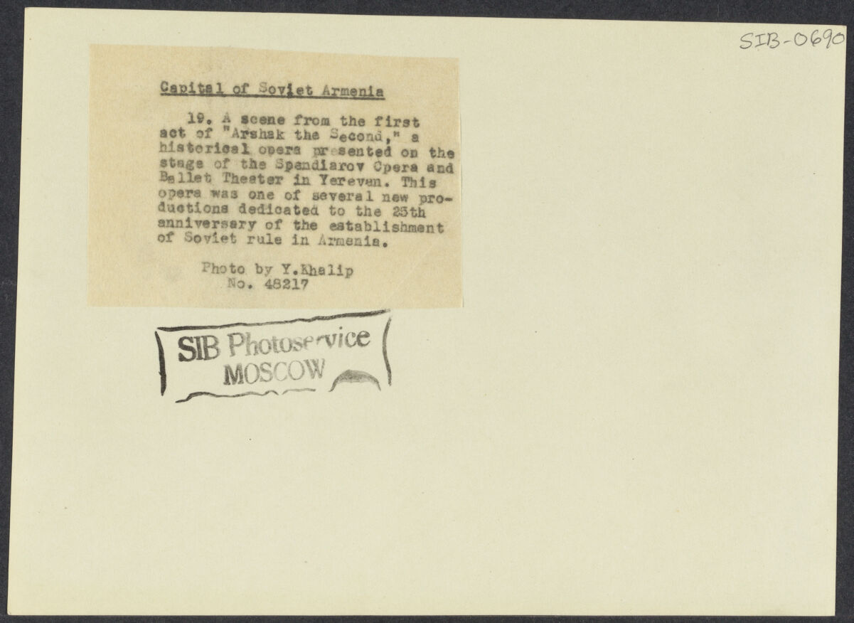 19. Capital of Soviet Armenia. A scene from the first act of Arshak the Second,a historical opera presented on the stage of the Spendiarov Opera and Ballet Theater in Yerevan. This opera was one of several new productions dedicated to the 25th anniversary of the establishment of Soviet rule in Armenia.