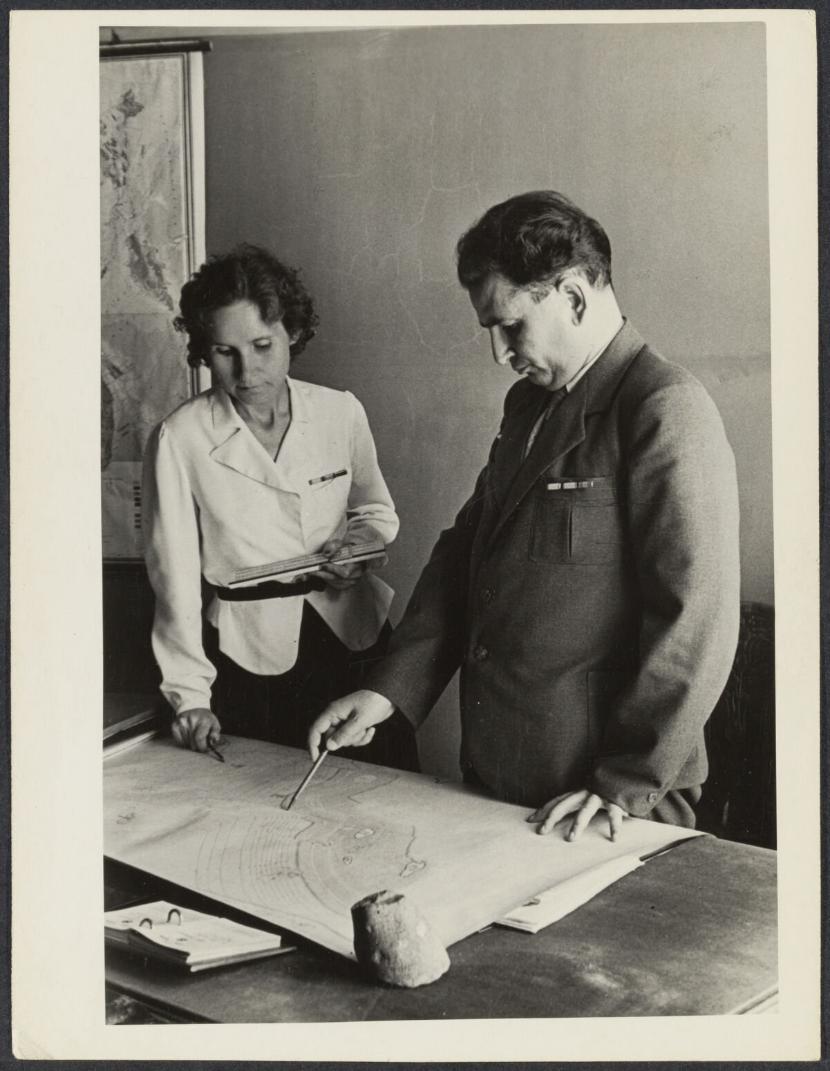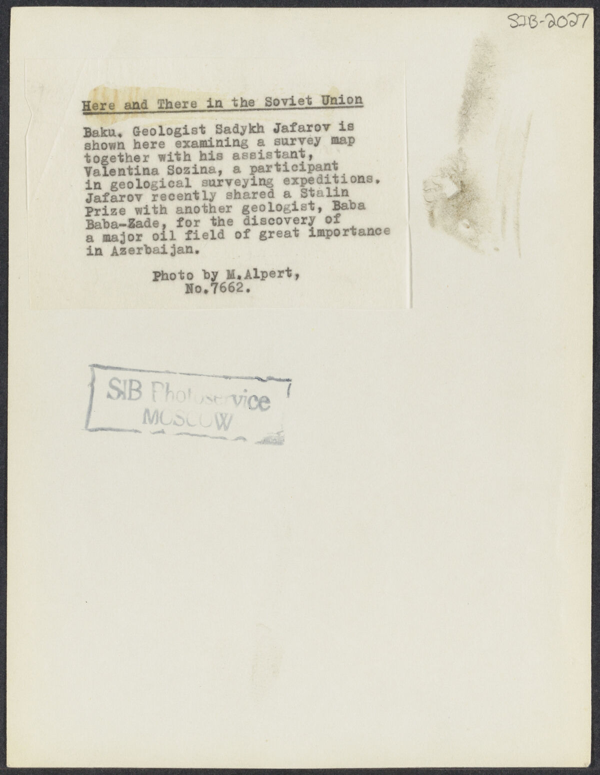 Here and There in the Soviet Union. Baku. Geologist Sadykh Jafarov is shown here examining a survey map together with his assistant, Valentina Sozina, a participant in geological surveying expeditions. Jafarov recently shared a Stalin Prize with another geologist, Baba Baba-Zade, for the discovery of a major oil field of great importance in Azerbaijan.
