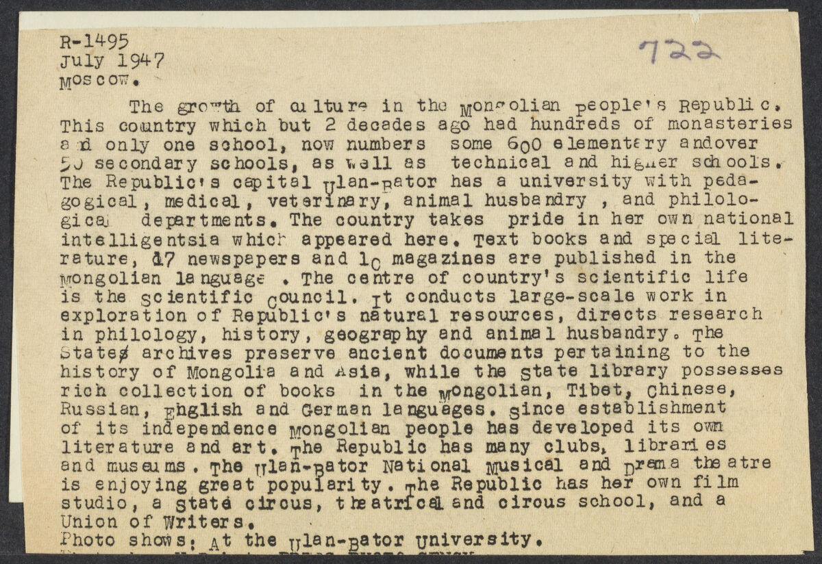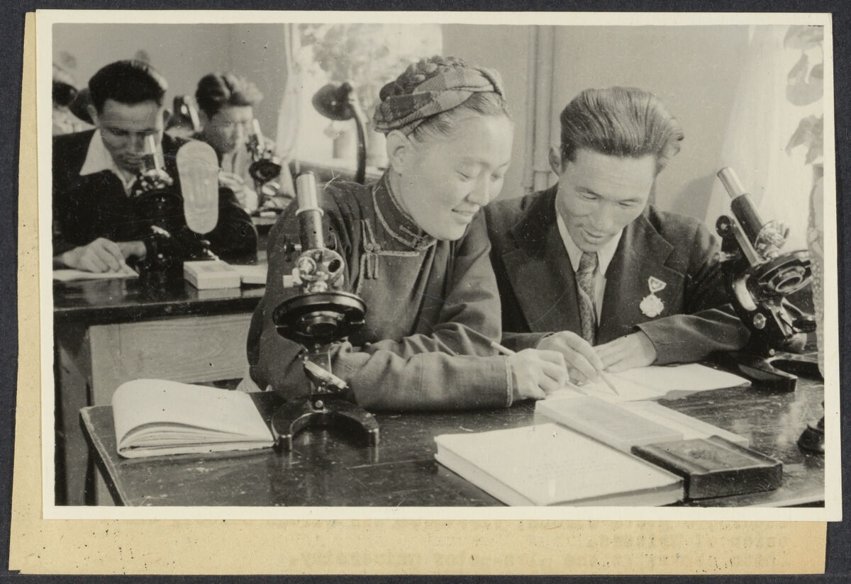 The growth of culture in the Mongolian People's Republic. / This country which but 2 decades ago had hundreds of monasteries and only one school, now numbers some 600 elementary and over 50 secondary schools, as well as technical and higher schools. The Republic's capital Ulan-Bator has a university with pedagogical, medical, veterinary, animal husbandry, and philological departments. The country takes pride in her own national intelligentsia which appeared here. Text books and special literature, 17 newspapers and 10 magazines are published in the Mongolian language. The centre of country's scientific life is the Scientific Council. It conducts large-scale work in exploration of Republic's natural resources, directs research in philology, history, geography and animal husbandry. The State archives preserve ancient documents pertaining to the history of Mongolia and Asia, while the State library possesses rich collection of books in the Mongolian, Tibet, Chinese, Russian, English and German languages. Since establishment of its independence Mongolian people has developed its own literature and art. The Republic has many clubs, libraries and museums. The Ulan-Bator National Musical and Drama theatre is enjoying great popularity. The Republic has her own film studio, a State circus, theatrical and cirous school, and a Union of Writers. / Photo shows: At the Ulan-Bator University.