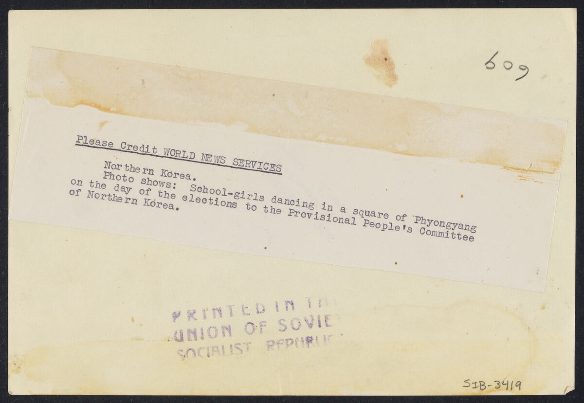 Northern Korea. Please Credit WORLD NEWS SERVICES/ Northern Korea./ Photo shows: School-girls dancing in a square of Phyongyang on the day of the elections to the Provisional People's Committee of Northern Korea.