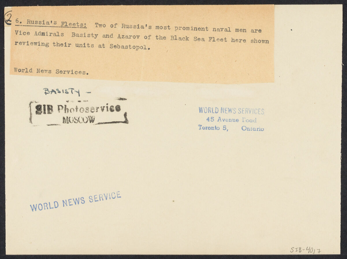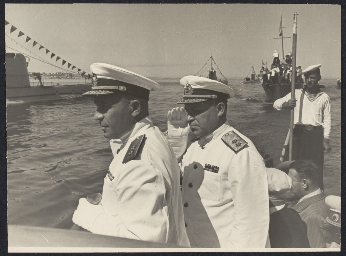 6. Russia's Fleets: Two of Russia's most prominent naval men are Vice Admirals Basisty and Azarov of the Black Sea Fleet here shown reviewing their units at Sebastopol./ World News Services.