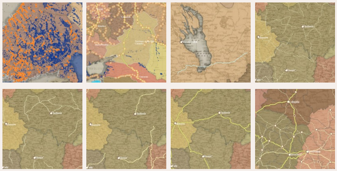Much of this length was devoted to post routes, of which there were no fewer than 2,869 (this according to the Post Road Itinerary fresh off the press of the Interior Ministry in 1824). These were the main arteries of communication for the imperial bureaucracy and play a significant role in the empire's spatial profile. But nearly half (99,412 kilometers) of the network was composed of carriage roads and it is worth taking a close look at how they compare with the post routes on the interactive map.